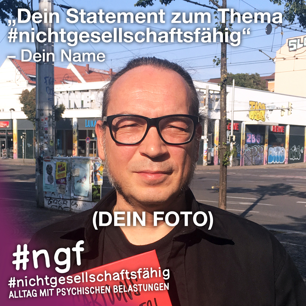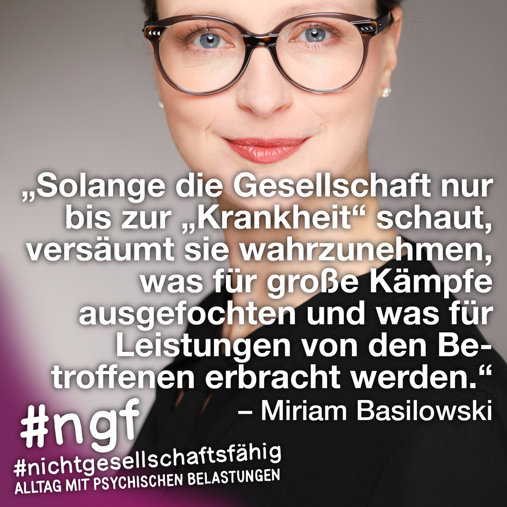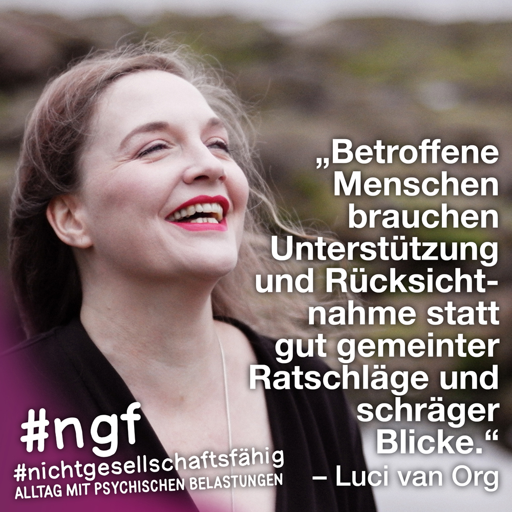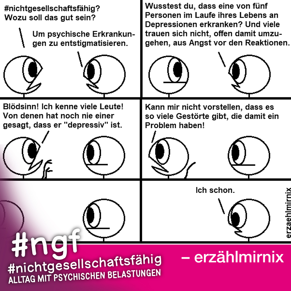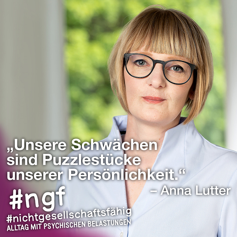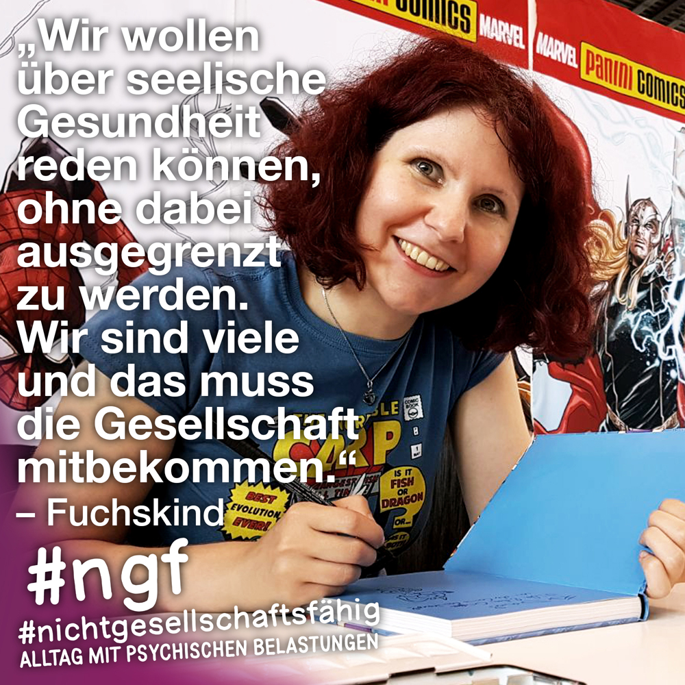 Unser Buch spricht auch deshalb mit vielen Stimmen, weil sowohl Betroffene als auch die, die täglich auf die verschiedenen Art und Weisen in-it sind, zu Wort kommen und auch die, die „an sich“ nicht tagtäglich mit psychischen Belastungen konfrontiert sind, sondern #nichtgesellschaftsfähig unterstützen, weil es wichtig ist. Das ist genau die Mischung, die wir möchten, weil genau auch das zur Enttabuisierung beiträgt und die Angst für alle nimmt. Die Angst davor, #nichtgesellschaftsfähig zu sein, sich nicht offen zu seinen psychischen Belastungen „bekennen zu dürfen“ und zu können, weil es gesellschaftlich so „abseitig“ anmuten mag und keiner darüber spricht, und die Angst davor, mit psychischen Belastungen konfrontiert zu sein.